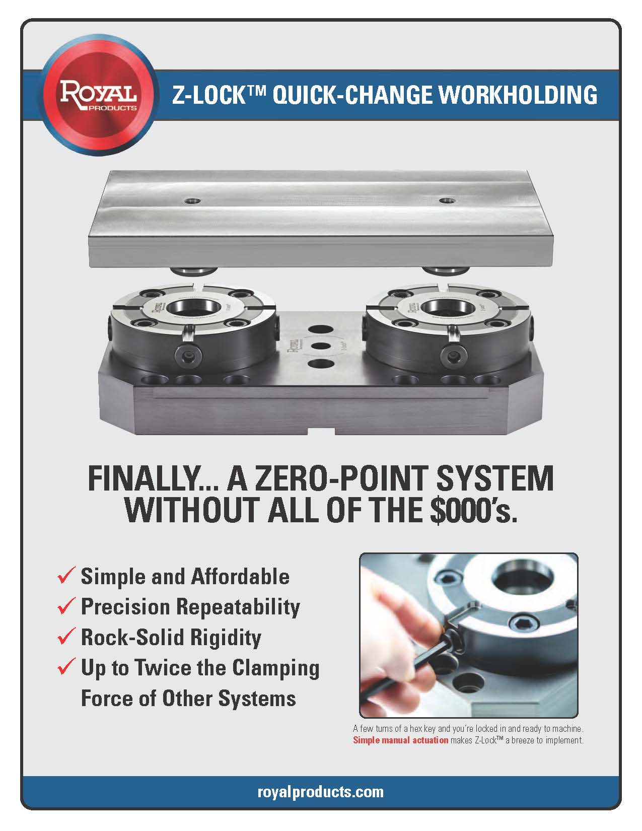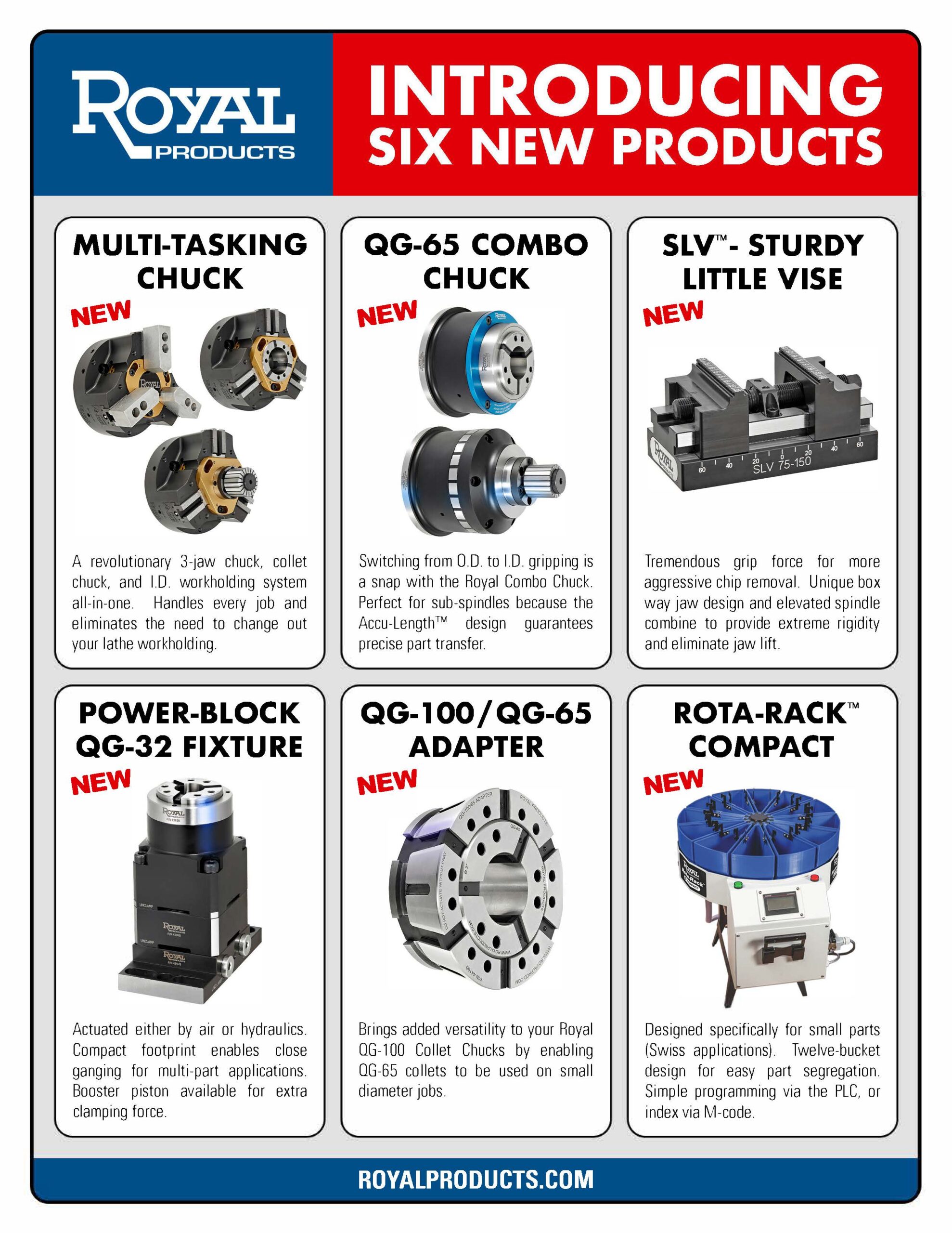 Royal Literature Master Catalog Please fill out the form below to receive your free copy of our new 180-page master catalog and to be added to the Royal mailing list. You may also view the entire 2025 Catalog PDF. First Name Last Name Company Address City State—Please choose an option—Non-USAlabamaArizonaArkansasCaliforniaColoradoConnecticutDelawareFloridaGeorgiaIdahoIllinoisIndianaIowaKansasKentuckyLouisianaMaineMarylandMassachusettsMichiganMinnesotaMississippiMissouriMontanaNebraskaNevadaNew HampshireNew JerseyNew MexicoNew YorkNorth CarolinaNorth DakotaOhioOklahomaOregonPennsylvaniaRhode IslandSouth CarolinaSouth DakotaTennesseeTexasUtahVermontVirginiaWashingtonWest VirginiaWisconsinWyoming Zip Country Phone Email Address Products of Interest (Check all that apply) GeneralFiltermist Mist CollectorsCNC Collet Chucks and ColletsMTC Multi-Tasking ChuckQG Combo Chuck Collet FixturesI.D. WorkholdingSLV Self-Centering VisesZero-Point Workholding Roto-Rack Parts AccumulatorsLive CentersCNC Bar PullersOther Comments (optional) 35+41=? New Products - Flyer MTC™ - Multi-Tasking Chuck Combo Chuck SLV™ - Sturdy Little Vise Quick-Grip™ Workholding Low-Profile Workholding I.D. Workholding Deburring Tools Rota-Rack™ CNC Bar Pullers Live and Dead Centers Z-Lock™ Workholding Machine Shop Accessories Milling & Drilling Tooling Solutions Filtermist Mist Collectors Quick-Grip Workholding Power-Block™ Flyer CNC Expanding Mandrel Flyer Rota-Rack™ Flyer Z-Lock™ Quick-Change Workholding New! Filtermist Flyer Filtermist Grinding Flyer Robodrill Mist Collection Made Easy New! Okuma Filtermist Mounting Bracket New!