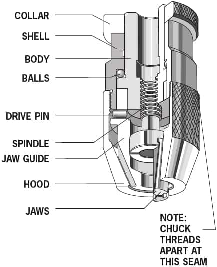 Caution – do not lubricate acme thread on body/spindle assembly. Thread must be clean and dry for chuck to work correctly.