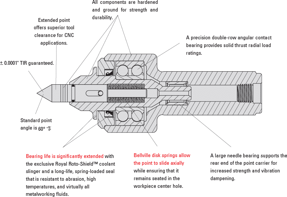 - Much longer operating life than other spring-type live centers due to the outstanding sealing characteristics of the exclusive Royal Roto-Shield™ coupled with a long-life spring-loaded neoprene seal.