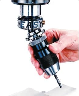 - One hand operation – simply depress the brass locking button and rotate collar to the locked-open position. When a new tool is inserted, it depresses a spring-loaded pin, snapping the collar back into the locked-closed position.