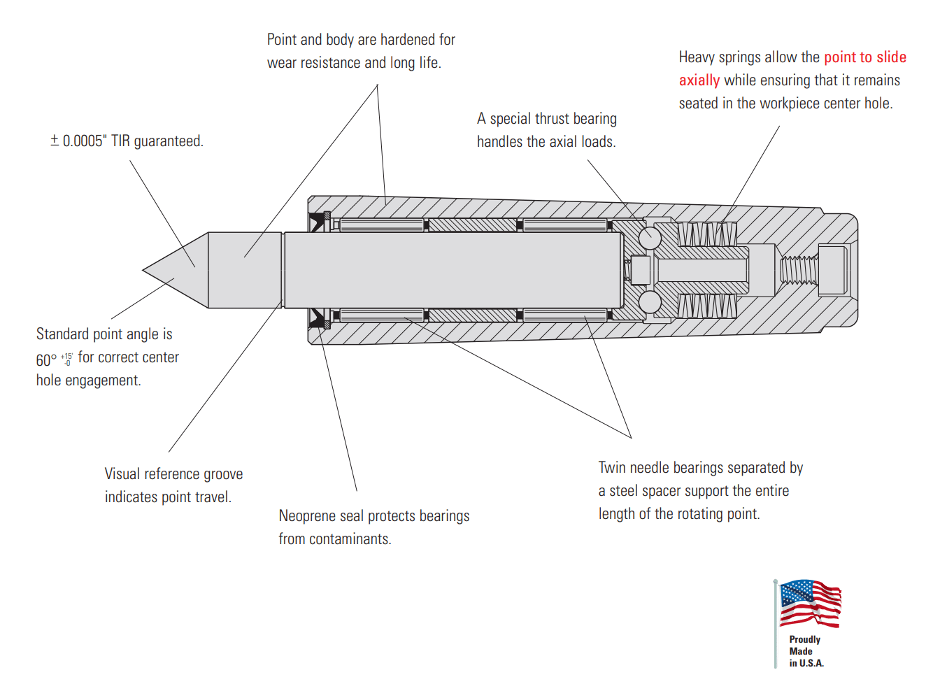 - Unique spring-loaded point compensates for workpiece thermal expansion.