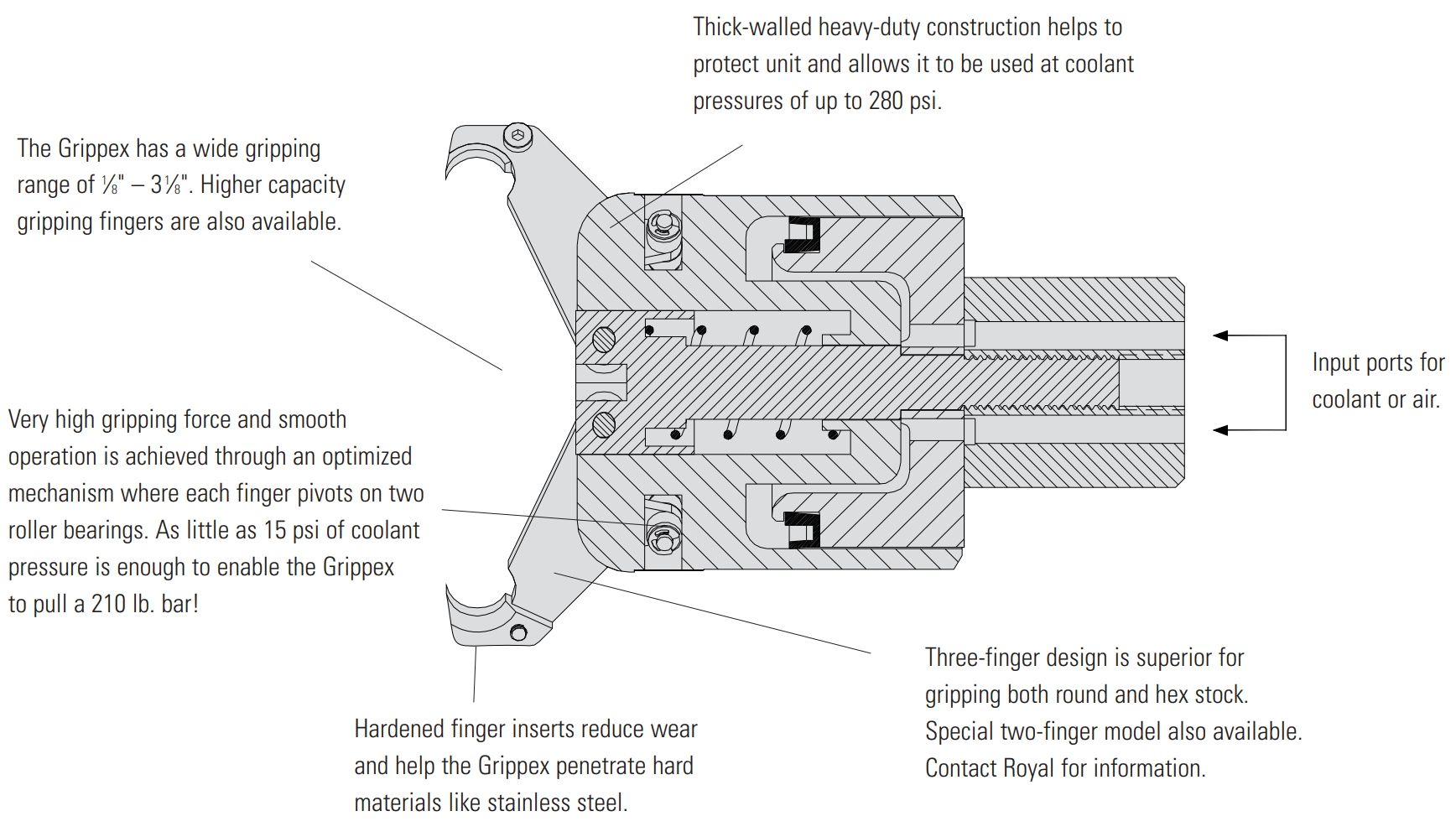 • The Royal Grippex 20L bar puller is actuated by a CNC lathe’s coolant system. As coolant is fed through the unit, it pushes a piston forward which causes the fingers to close around the bar stock. When the coolant is turned off, the fingers automatically spring open.