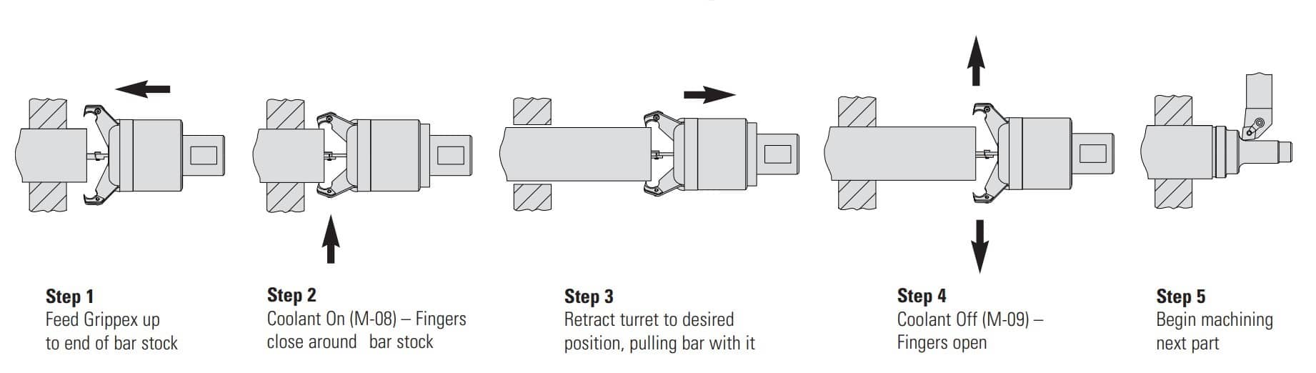 • Self-adjusting mechanism – fingers will close down until they contact the bar stock so no presetting is necessary. This feature allows the Grippex to make multiple pulls on the same workpiece, even after the OD has been turned.