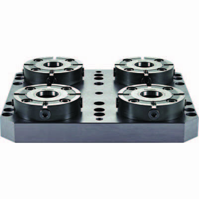 - Baseplates include multiple bolt-patterns to accommodate most common machining center T-slot spacing.